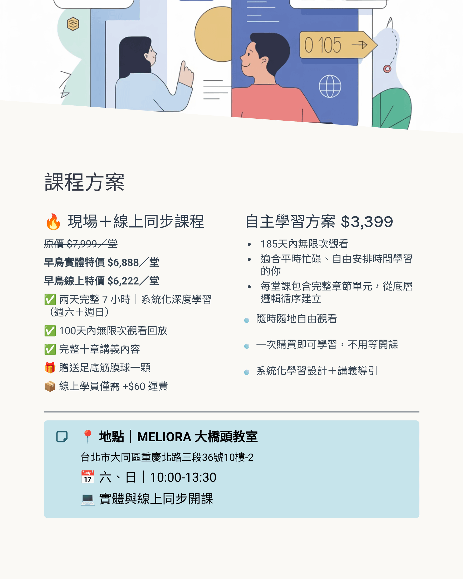 • 老師即時互動,專業指導 • 體驗實體課程氛圍 • 100天內無限次觀看回放 • 完整十章節的專業講義 • 贈送足底筋膜球一顆