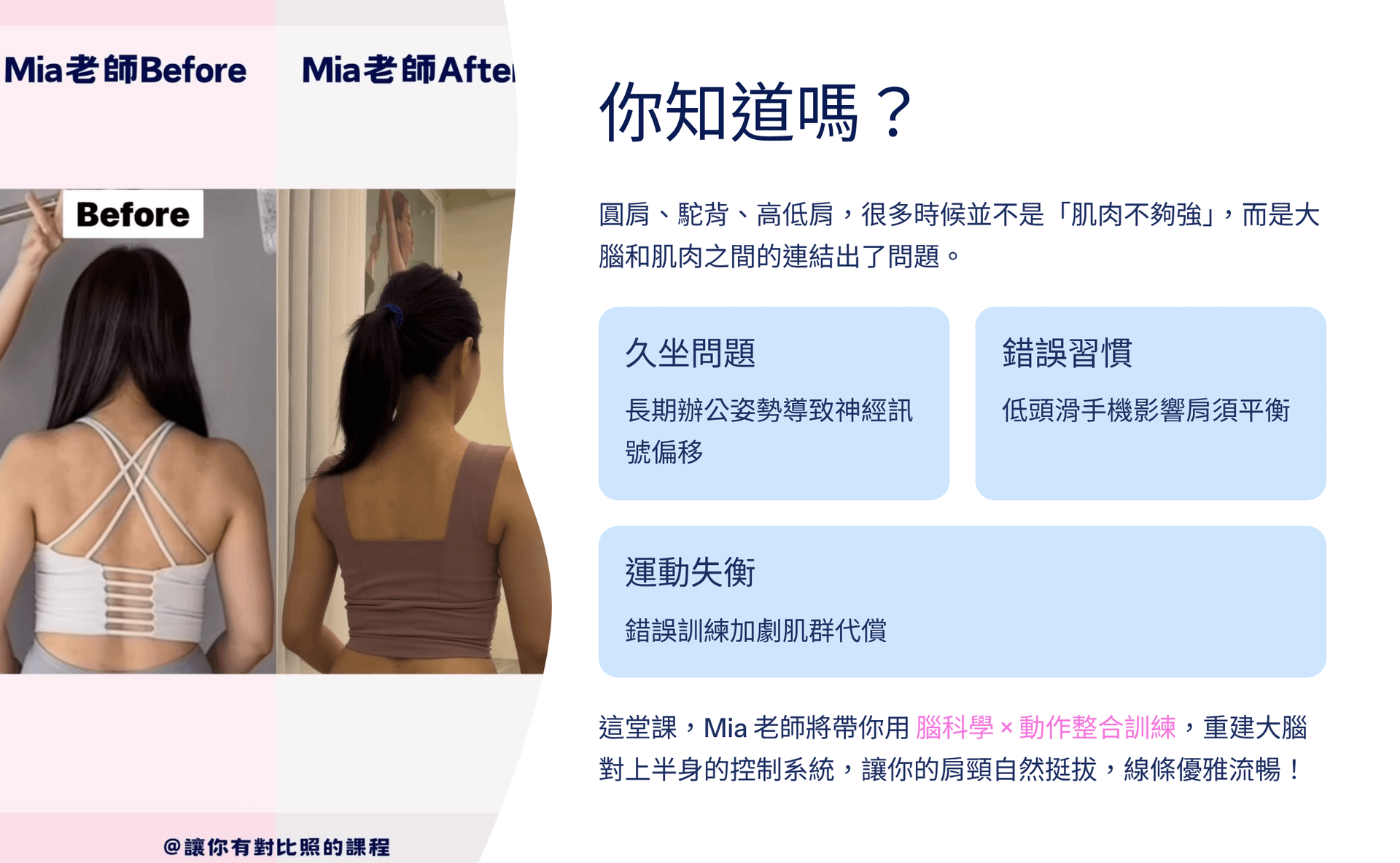 在2025年,我更率先把形體矯正與腦科學整合,發展出「獨家系統」:肌肉意象法 &感知強化,讓學生不只「改變一次」,而是能輕鬆維持最好的體態。