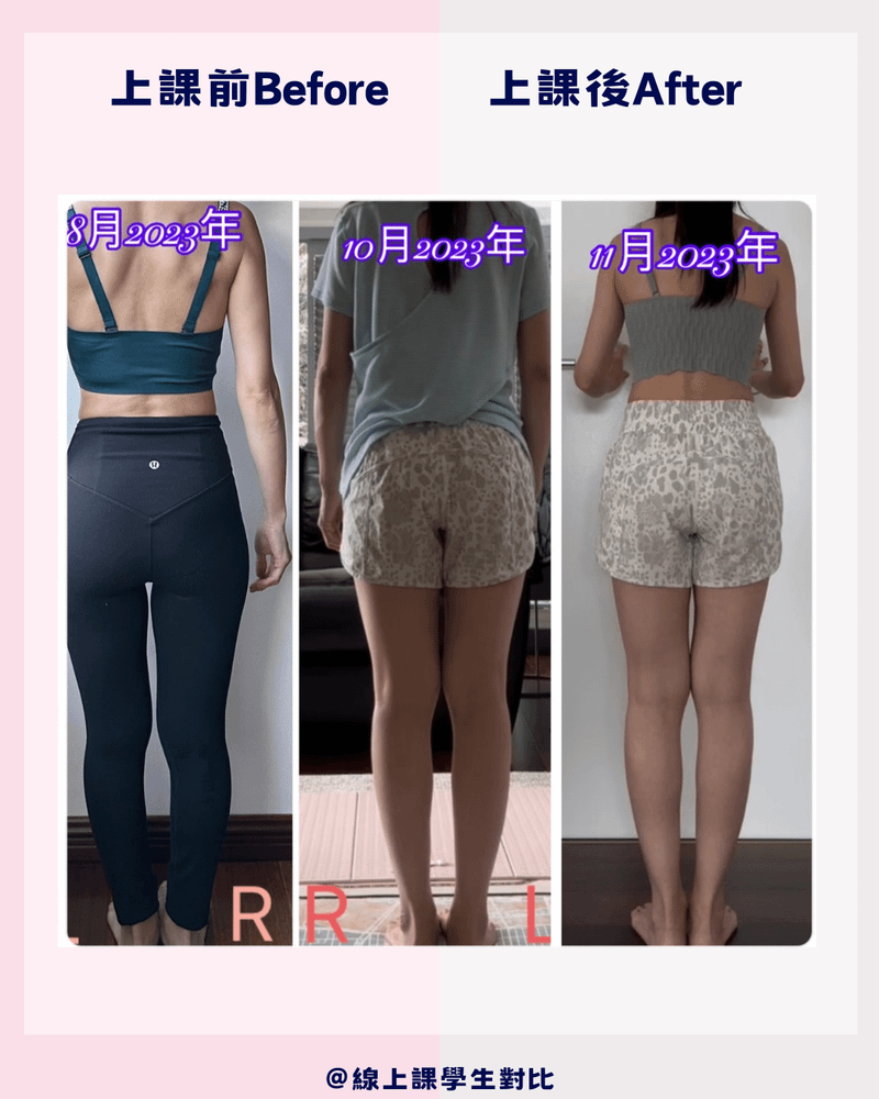 至今,我已幫助超過100+ 位學員,從上半身的肩背到下半身的臀腿,從內而外完成了體態的改變。